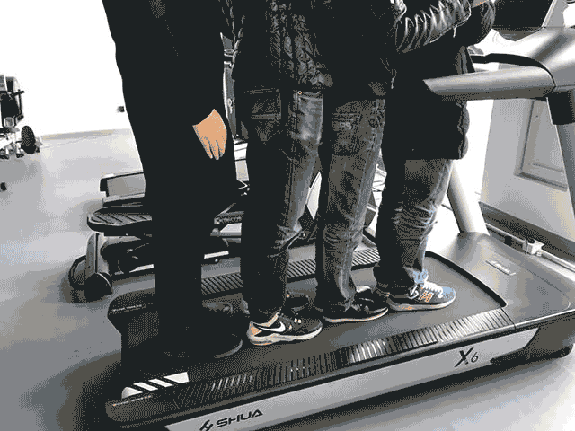 发现这台跑步机竟然根本无视于我们的体重,载着五个人毫无违和感(看上图)。 所以,你的体重如果超过200斤,在使用这台机器时,也可以放心蹦跶。
